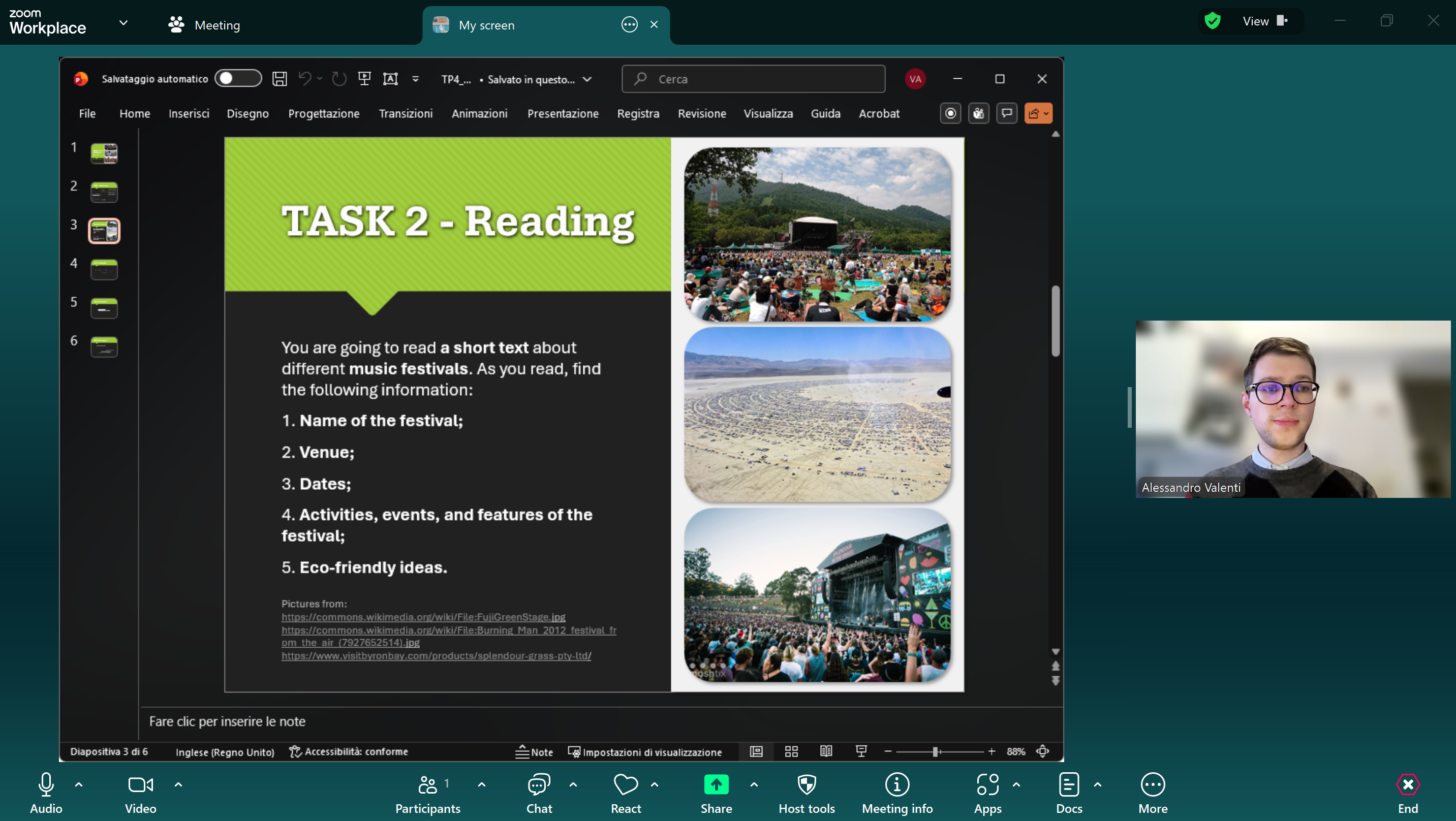 Le mie lezioni online si svolgono tipicamente su Zoom o Google Meet. Preparo delle presentazioni Powerpoint e condivido il mio schermo con le varie attività, e quando necessario annoto le slide oppure uso la funzione lavagna. Di solito chiedo agli studenti di svolgere le attività in un Google Docs condiviso, in modo da poterli monitorare in maniera efficace e di poter fornire un feedback preciso e costruttivo. Le lezioni utilizzano spesso esercizi interattivi su piattaforme come Google Form o Padlet.Istruzione verificata